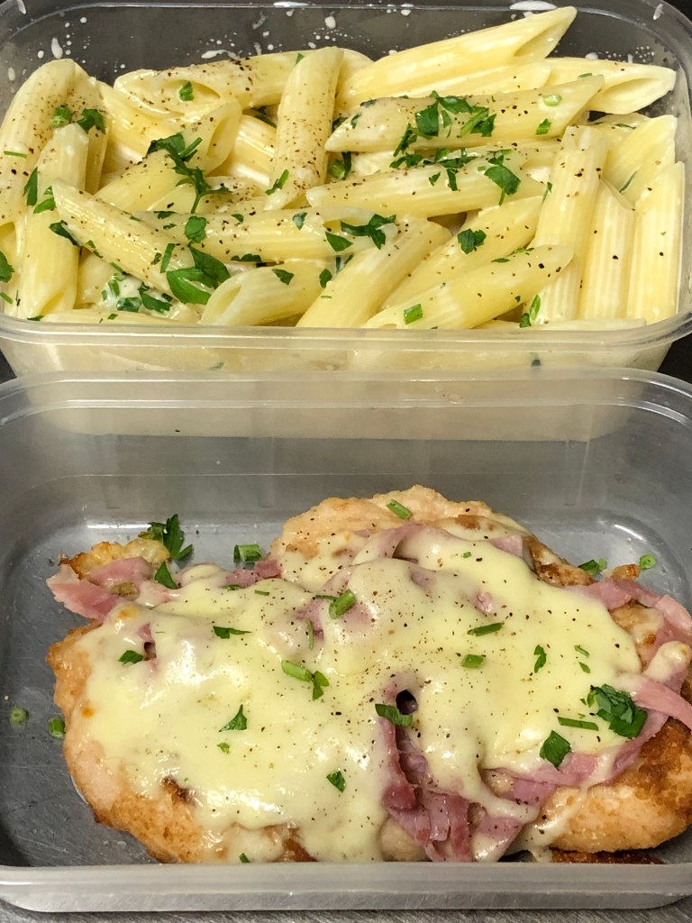 fried pan breast of chicken covered with ham and melted mozzarella, comes with pasta same sauce, chips and salad.