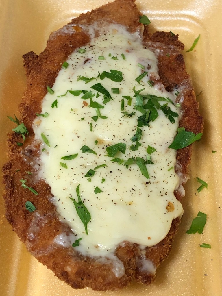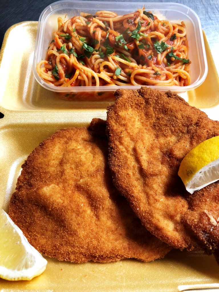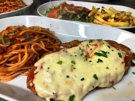 Chicken Parmigiana, breaded chicken covered in tomato and melted mozzarella comes with spaghetti Bolognese OR Spaghetti Napoli, chips and salad.