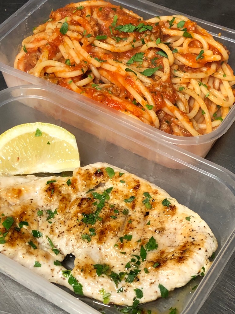seasoned with fresh parsley and lemon, comes with spaghetti Bolognese or spaghetti Napoli, chips and salad.