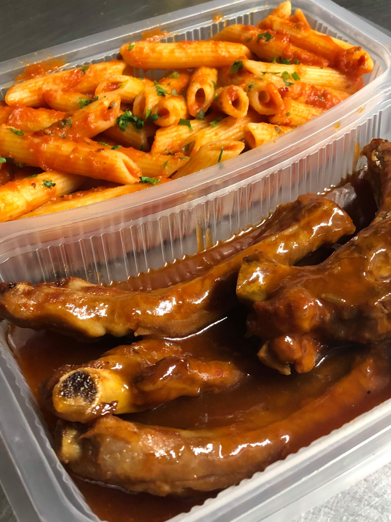 5/6 BBQ pork ribs comes with penne arabbiata or penne Napoli chips and salad