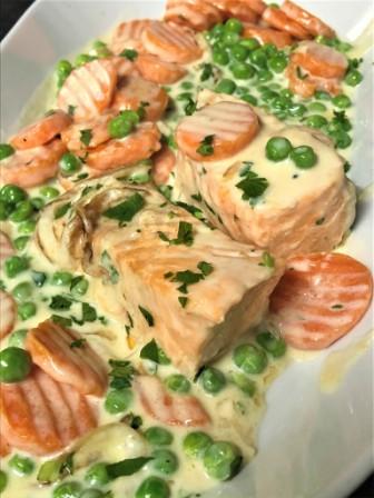 Salmon fillet with carrots, peas, in creamy sauce, comes with penne same sauce, chips and salad.