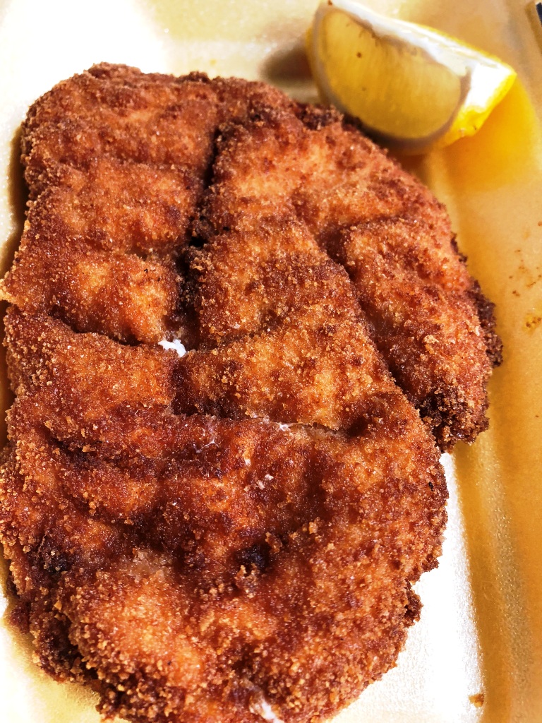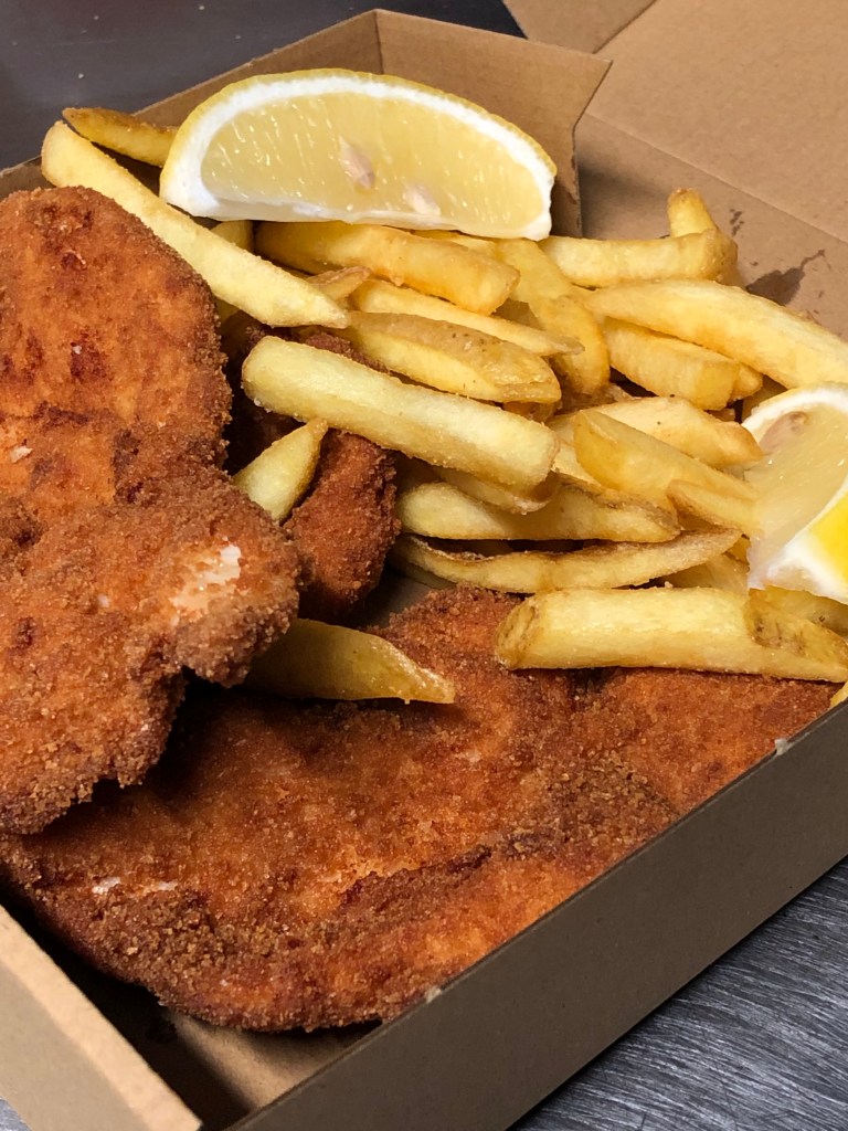Fresh chicken escalope bites with chips