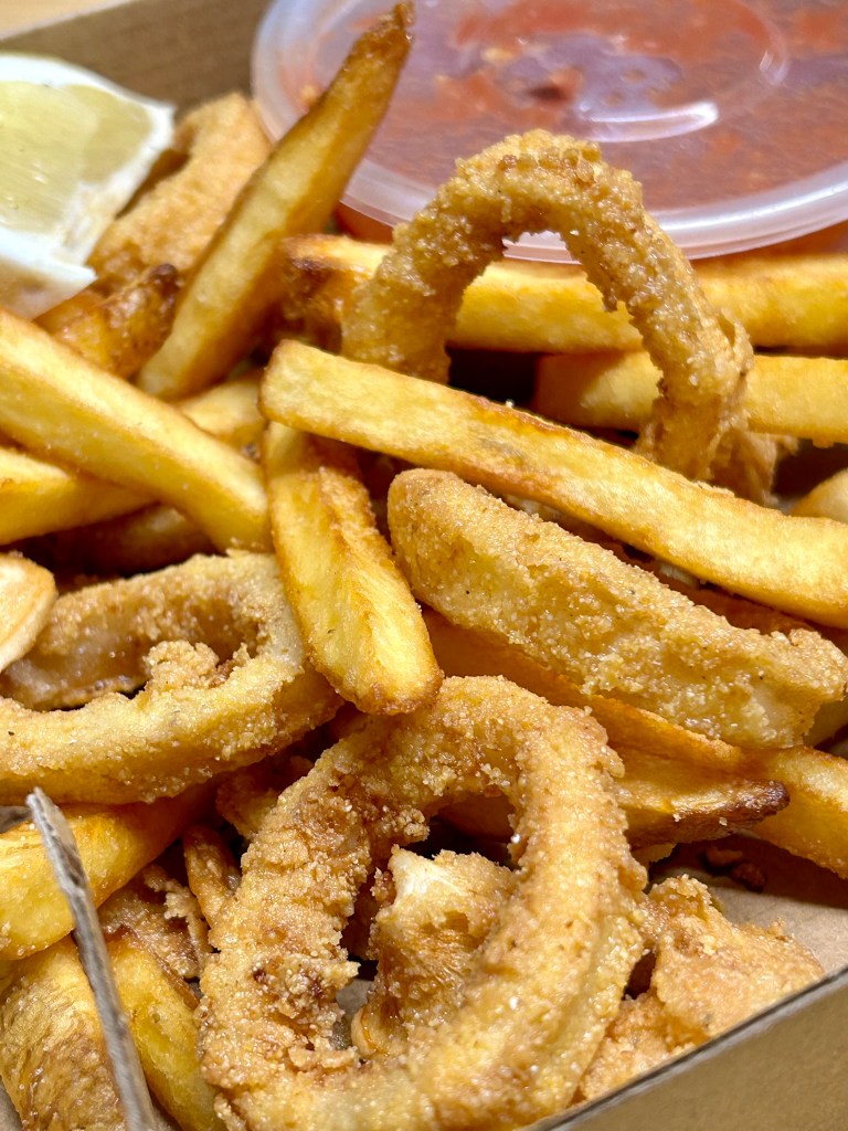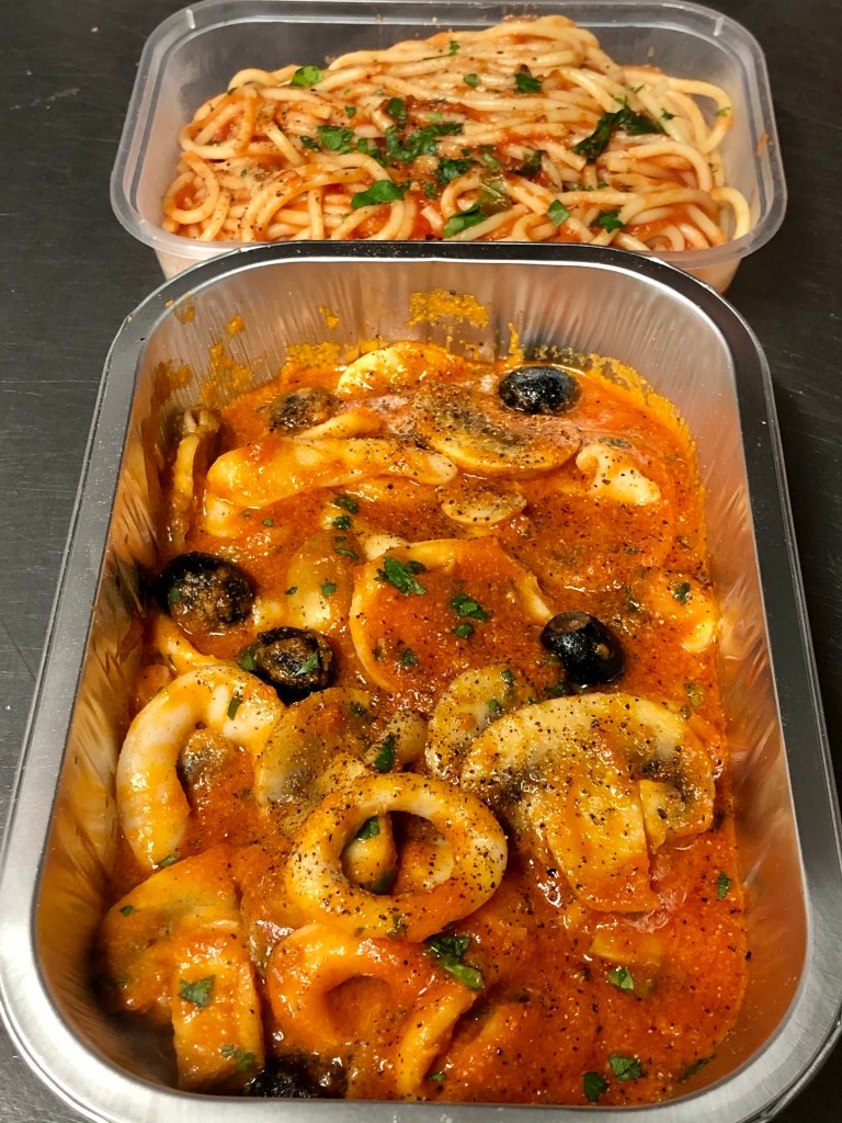 Calamari rings with mushroom and black olives in tomato sauce, comes with spaghetti same sauce, chips and salad £