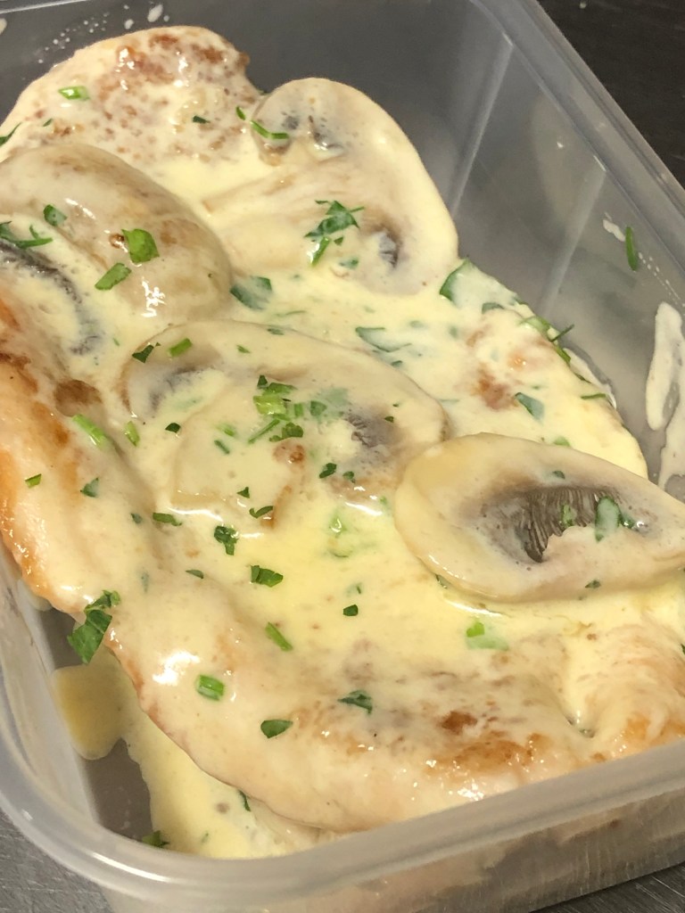 Brest of chicken cooked with mushroom in creamy sauce, comes with penne pasta in the same sauce with chips and salad.