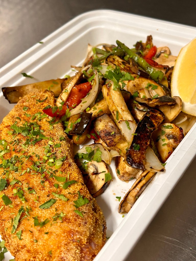 Pan fried tuna steak coated in our unique coating, comes with roasted vegetables, chips and salad.