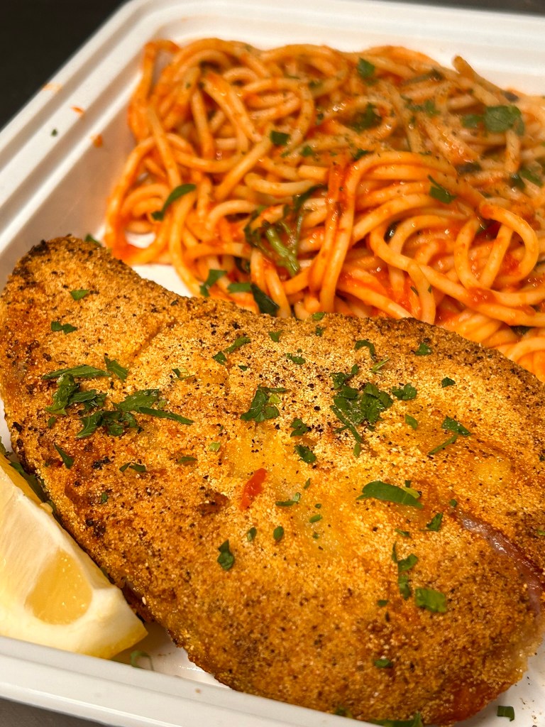 seasoned with fresh parsley and lemon, comes with chips and salad. No pasta.