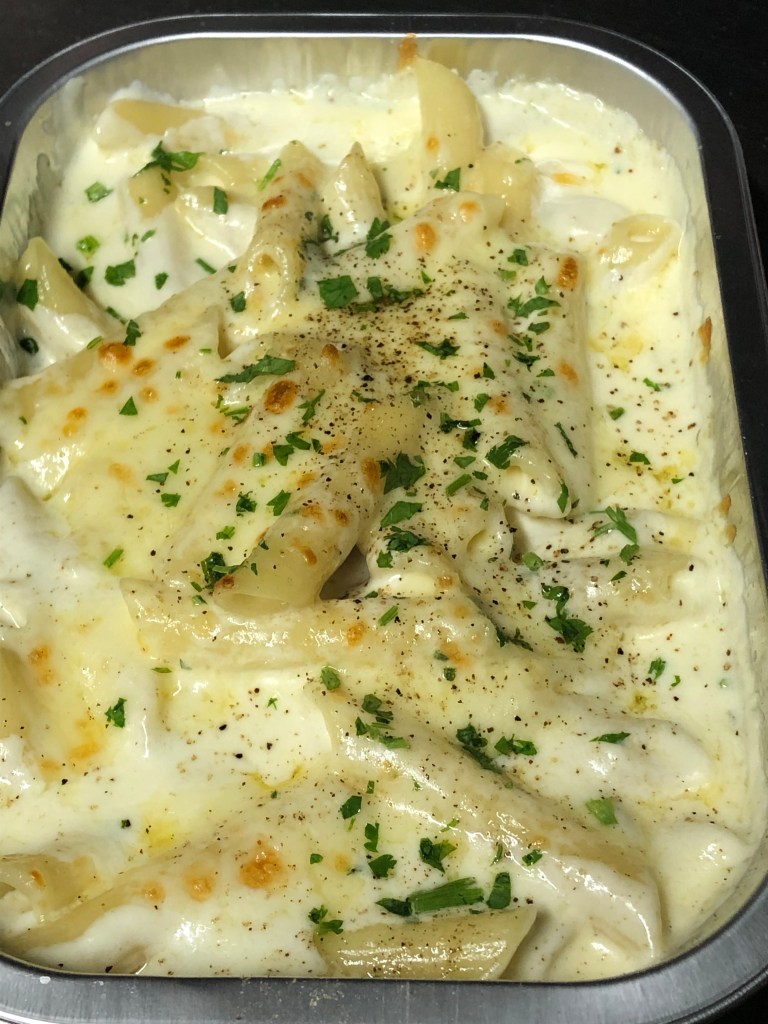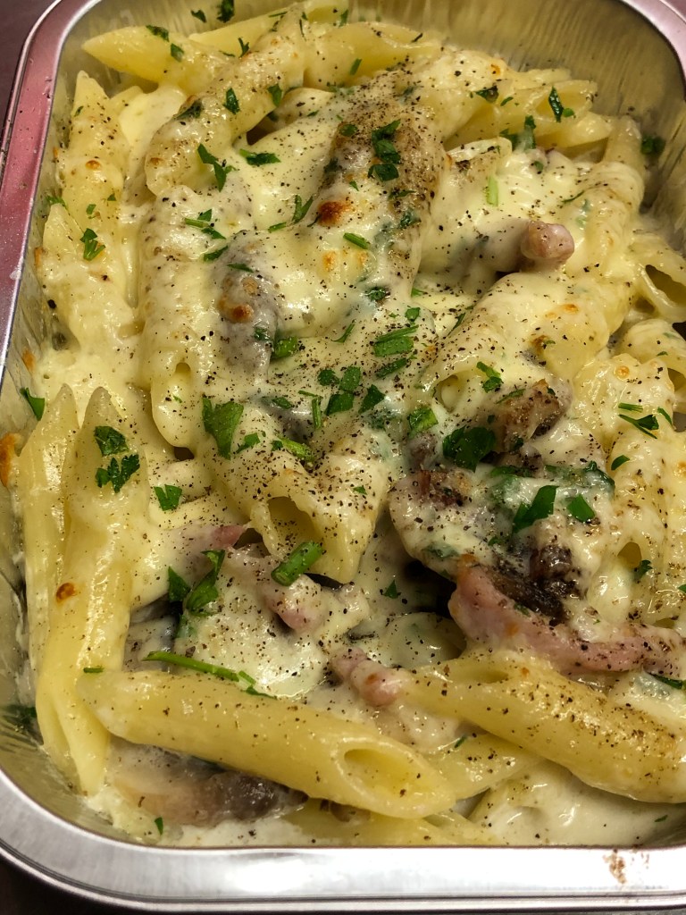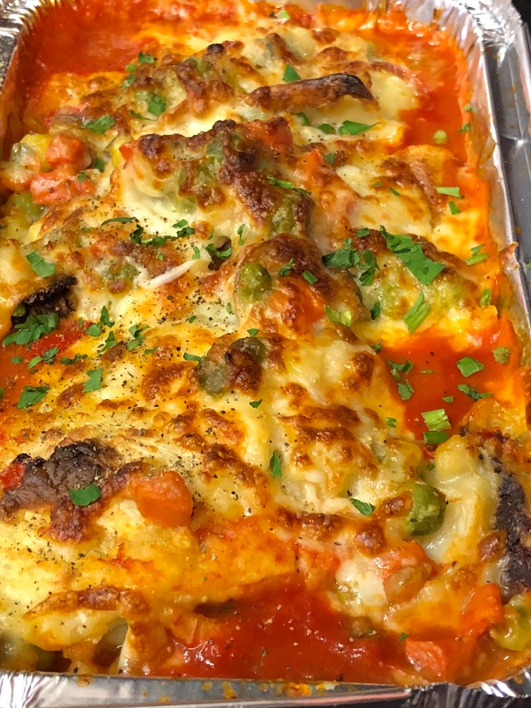 with, carrots, mushroom, peas, green and red peppers, sweetcorn, bechamel sauce made with our own fresh pasta sheets